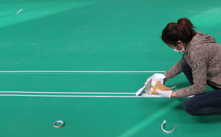 5、根據羽毛球場地尺寸劃線 6、完成羽毛球場地板工程解決方案